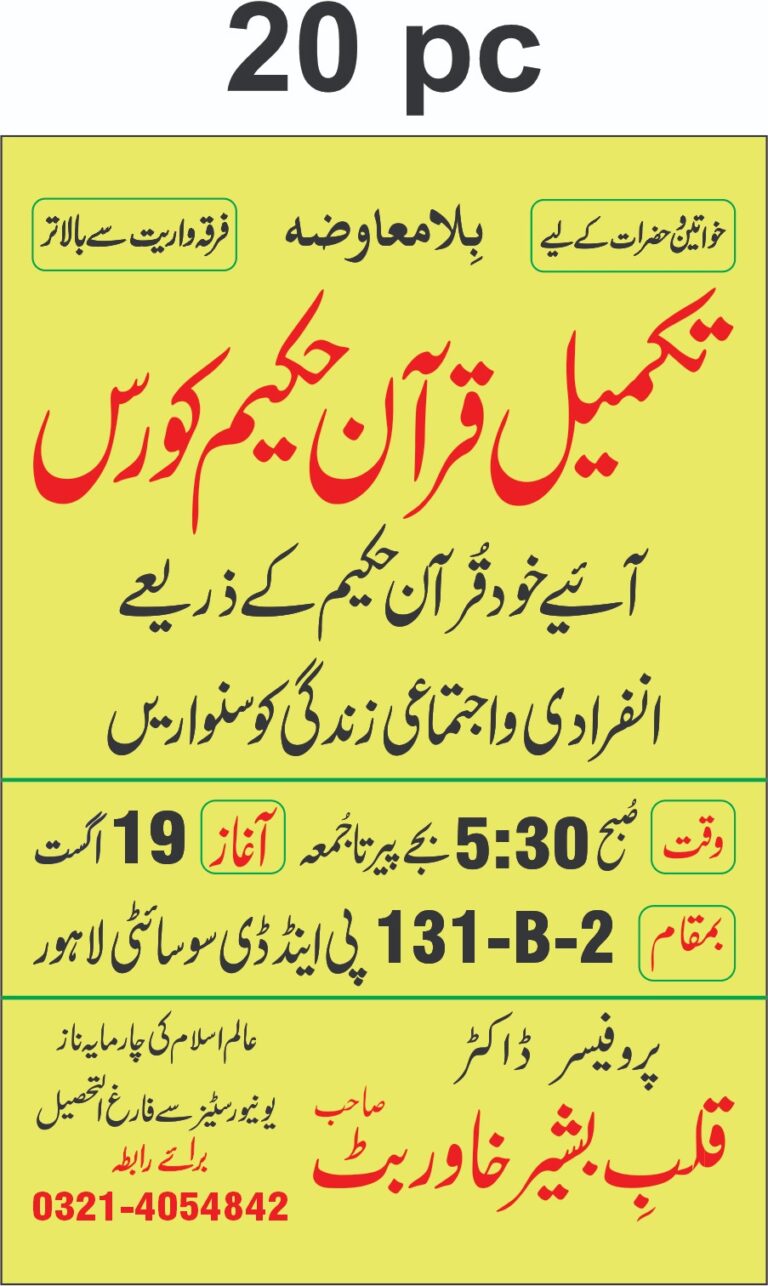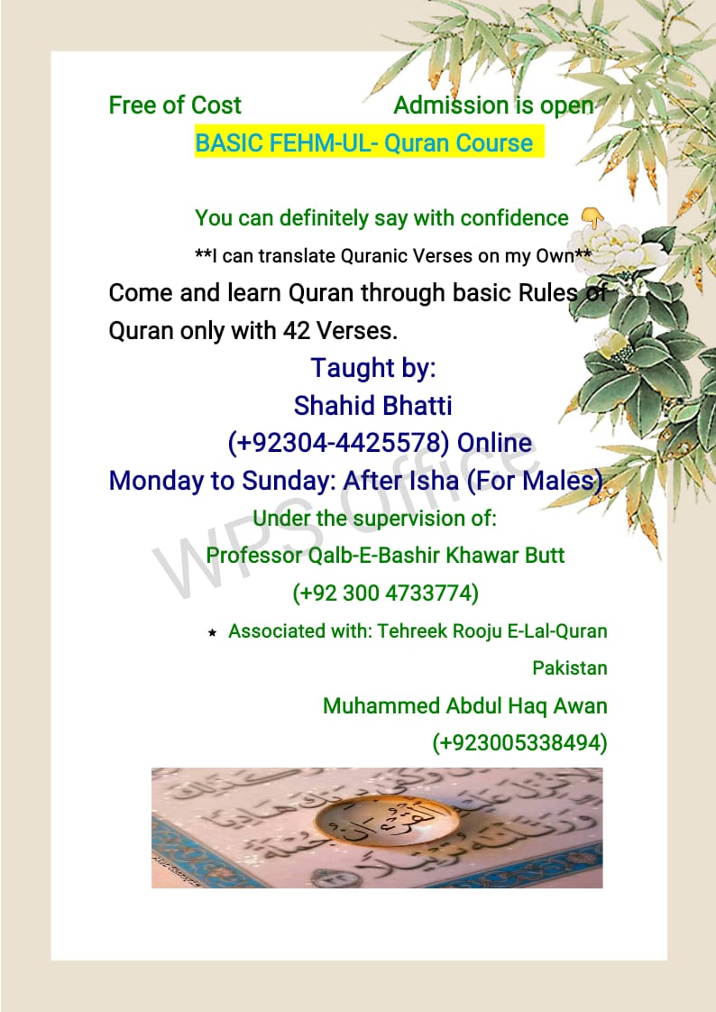 السلامُ علیکم ورحمتہ اللہ وبرکاتہ ۔ ان شاءاللہ تکمیلِ قرآن کلاس کل بروزِ اتوار تاریخ 30 جون 2024 پاکستانی وقت کے مطابق صبح 06.00 بجے قرآن و سنت انسٹیٹیوٹ نزد شیل پمپ مزنگ چونگی لاھور میں ھو گی۔ امیر قرآن ھاؤس پروفیسر ڈاکٹر قلب بشیر خاور بٹ صاحب پارہ نمبر 15 سورہ الکہف ایت نمبر 39 سے پڑھائیں گے ۔ یہ کلاس زوم لنک پر بھی آن لائن آئے گی۔ http://us02web.zoom.us/j/893026610 آپ سے گزارش ھے کہ وقت پر تشریف لائیں تاکہ بروقت کلاس شروع ھوسکے۔ اسکے علاوہ قرآن کلاس کی دعوت اور لوگوں تک بھی پہنچائیں ۔شکریہ۔ قرآن ھاؤس سوسائٹی لاھور۔